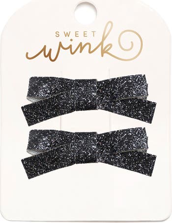 - This clip set includes: 2 black glitter bow hair clips.