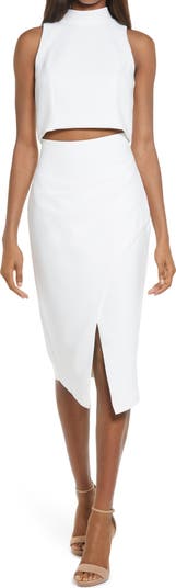 Set your style to stun in this sultry, two-piece sheath designed in a sleeveless, fitted silhouette and ready to show off a slip of skin in the center.
