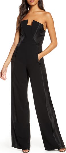 Stylishly stun the crowd at your next formal event wearing this strapless jumpsuit fixed with a notched neckline and wide-swept legs.