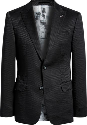 This blazer is fashioned from a textural stretch fabric with luminous sheen that elevates it for evening without sacrificing comfort. Peaked lapels and contrast stitching sharpen the look, while the slim, tailored fit delivers structure.