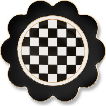 Set the table in style with this elegant porcelain plate featuring checks and petal-inspired scalloping.