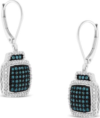 Elegant and timeless, these gorgeous sterling silver dangle earrings feature 0.75 carat total weight of round, brilliant cut white diamonds and heat treated fancy blue diamonds with 158 stones in all. The earrings feature a square shape filled with blue diamonds surrounded by rhodium plated prongs. The square shape has a cushion shaped halo of white diamonds. Above this halo is a smaller, stair stepped cushion shape behind the first. The earrings feature leverback backings that keep these pierced earrings safe and secure on your ears for comfortable, worry-free wear all day long. This authentic design is crafted of real 92.5% sterling silver that has been electro-coated with genuine rhodium (a platinum-family metal), ensuring it will keep a tarnish-free shine for years to come. These classic earrings make a great gift for any special occasion! Give her a gift that will perfectly complement her favorite ensemble.