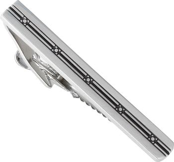 This polished silver tone tie bar features etched details accented in black. It is great for black tie and just as great for everyday suited-up styles.
