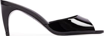 Almond toe classic mule, set on a c-curve mid heel. made with smooth patent leather.