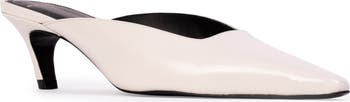 A streamlined silhouette with a kitten heel and pointy toe highlights the sleek minimalism of this party-ready leather mule.
