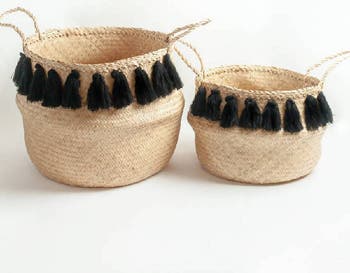 Designed with versatility and function in mind. Long black tassels add a modern element to a traditional Vietnamese seagrass basket. Hand-woven by a group of amazing women in Hanoi, each basket represents hours of work and generations of artistic heritage. Each basket is hand-woven by a group of amazing women in Hanoi, Vietnam and represents hours of work and generations of artistic heritage.