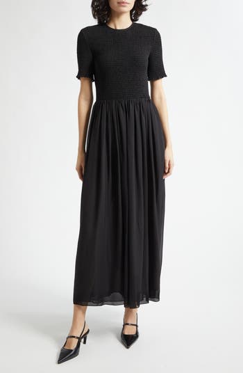 A smocked bodice and sleeves lend stretch and dimension to this flowy georgette maxi dress that moves with you.