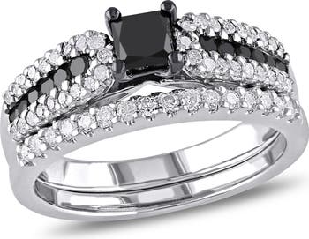 Commemorate your eternal bond with the bold luxury and striking contrast of this substantial bridal set. Crafted in luminous sterling silver, the set features a compelling mix of princess-cut black diamonds and brilliant white diamonds. The unified design of the engagement ring and matching wedding band creates a sophisticated, modern statement that symbolizes the complex and profound depth of your love. This set delivers commanding presence and unique, unforgettable style.