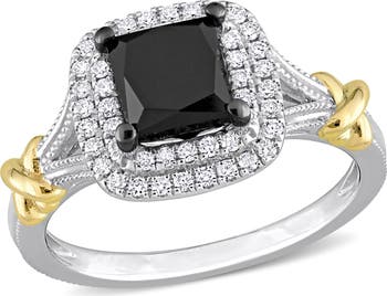 Accessorize glamorously with this exquisite princess halo ring. Crafted in luminous 14k white gold and yellow gold, this vintage ring features a princess-cut, prong-set black diamond surrounded by a double halo created by 48 round-cut, buttercup-set diamonds on this split-shank ring. Enhanced with a polished finish, this stunning ring is a valuable asset. A royal ring for timeless beauty.