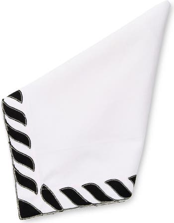 A black-and-white border details an elegant cotton napkin designed to instantly elevate your table setting.