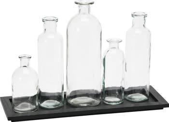 - This stylishly versatile vase set features a sleek wood tray topped with 5 glass bottles in varying sizes