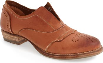 A menswear-inspired shoe with a decidedly feminine silhouette, this casual slip-on oxford features brogue details at the toe and heel and bas-relief stamping in place of shoelace grommets. Supple distressed leather and rubber welting at the sole keep the look both casual and forward-thinking.