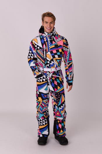 Model information - Height 5'11" | 38" Chest, 32" Waist | Wearing size Medium At a Glance Features: Are you bored of plain black, navy and grey ski suits? US TOO.... You need fun and colour on the mountains! We are empowering you to rip up the slopes with panache & style, whilst dropping jaws & turning heads as you strut into Après like a boss as the beat drops. On top of this all of our outerwear is made from recycled polyester meaning you can look amazing and do your bit for the planet at the same time! The OOSC Men's ski suit is the only piece of ski clothing you'll ever need, from dropping cliffs to dropping jagerbombs at Après, this one piece will keep you warm and dry all season long! The OOSC mens / unisex suit is a relaxed Freeride fit. Other Features: Water Proof Exposed Zippers Lift Pass Pocket Fleece Chin Guard Goggle Pocket Cuff Gaiters With Thumbholes Reinforced Durable Ankle Patches Helmet Adaptable Hood Elasticated Ankle Gaitors Velcro Adjustable Wrist Straps Elasticated Waist & Adjustable Belt Mesh Lined Vents Shaped Elbows & Knees Full list of our technical features. OOSC are extremely proud to have be able to say that ALL of our outerwear is made from Recycled Polyester and each suit is made from at least 100 plastic bottles!! (Read about how our suits are made from plastic bottles)