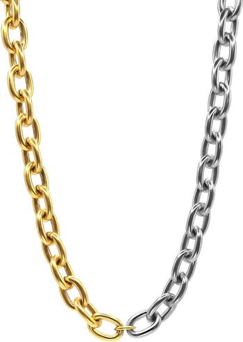 Two tones, one statement. The Blair Necklace turns up the contrast with a 50/50 split of chunky gold and silver chains, creating a bold, mixed-metal moment you can wear every day. Featuring an easy-to-use toggle clasp, this necklace is designed to be styled your way — front and center, off to the side, or layered with your favorite stacks. Edgy or elevated, day or night — the Blair Necklace is your go-to for effortless style. Handle With Care: To preserve the shine and finish of your statement jewelry, avoid water, sweat, and direct contact with lotions or perfumes. Remove before showering, swimming, or working out.