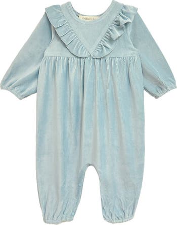 - The Blair Romper for baby girls is a dreamy outfit that combines comfort and style seamlessly. Crafted from ultra-soft velvety fabric in a light blue hue, it features a delicate ruffled V-shaped neckline and gathered fabric for a loose, relaxed fit. Fabric Content & Care 95% POLYESTER 5% SPANDEX Machine Wash Cold
