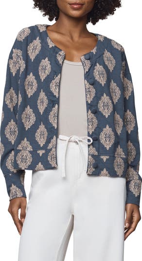 Ornate embroidery elevates this soft cotton-modal jacket made in a boxy fit and fronted with covered buttons.