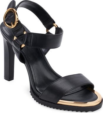 Polished hardware adds gleaming detail to this lofty sandal given a touch of moto edge from a harness-inspired quarter strap.