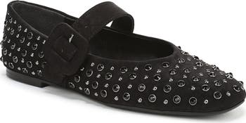 Shimmering crystals add an extra touch of glamour to a streamlined flat complete with a classic mary jane strap.
