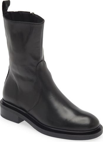A rear pull-tab and side zipper lend easy wear to a rich leather bootie balanced by a plain toe and stacked heel.