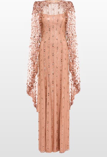 The Blaize gown is a breathtaking expression of elegance and refinement, crafted for moments that call for unforgettable glamour. Rendered in a soft, ethereal hues, this floor-length gown features exquisite hand-sewn embellishments, with delicate sequins and crystals cascading in vertical lines that elongate the silhouette. The fitted bodice seamlessly flows into a fluid skirt, while the sheer cape sleeves, adorned with shimmering beadwork, create a sense of movement and dramatic allure. Radiating sophistication, the Blaize is designed for grand occasionsfrom black-tie galas to evening receptionswhere timeless style meets contemporary grace. Pair with subtle heels and fine jewelry for a look that exudes understated luxury while commanding attention.