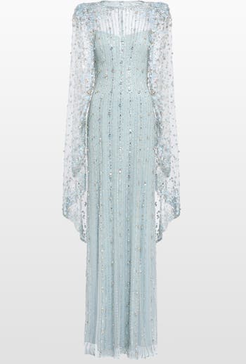 The Blaize gown is a breathtaking expression of elegance and refinement, crafted for moments that call for unforgettable glamour. Rendered in a soft, ethereal hues, this floor-length gown features exquisite hand-sewn embellishments, with delicate sequins and crystals cascading in vertical lines that elongate the silhouette. The fitted bodice seamlessly flows into a fluid skirt, while the sheer cape sleeves, adorned with shimmering beadwork, create a sense of movement and dramatic allure. Radiating sophistication, the Blaize is designed for grand occasionsfrom black-tie galas to evening receptionswhere timeless style meets contemporary grace. Pair with subtle heels and fine jewelry for a look that exudes understated luxury while commanding attention.