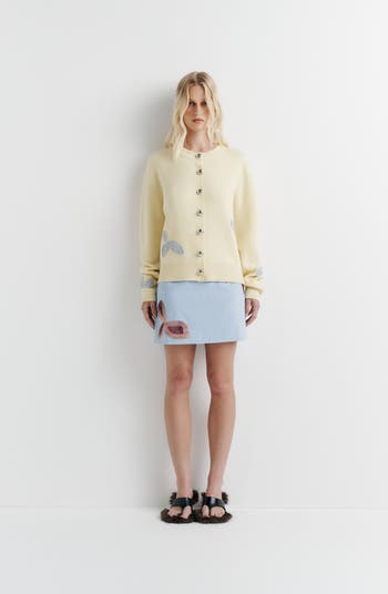 A relaxed crew neck cardigan featuring statement round metal buttons and delicate hand made lurex crochet motifs.