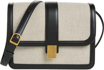 A sculptural clasp plated in 18-karat gold elegantly details the flap of this canvas crossbody bag crafted in a structured silhouette with a well-organized triple-compartment interior lined in supple nappa leather.
