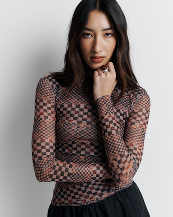 Double layer mesh funnel neck top featuring gathering along side seam to flatter the body and bell sleeves. Artwork in collaboration with Phoebe Willis. *improved fit, runs true to size.
