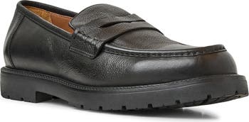 A lugged rubber sole provides a sturdy foundation for a water-resistant loafer featuring a classic penny keeper and slim apron toe.