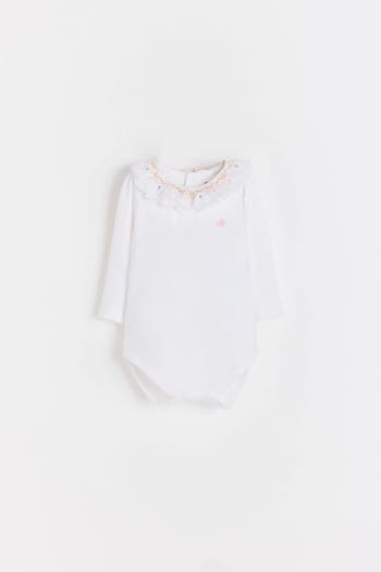 Long-sleeved pima cotton bodysuit with an embroidered smock detail on the plain-knit collar. Snaps at the back and crotch for easy changing.