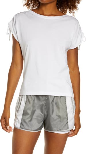 Drawstring ruching gathers up the short sleeves of this fresh take on the classic T-shirt cut from an exceptionally soft cotton-blend knit.