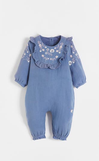 Blue muslin Romper for girls with floral embroidery detailing on the yoke and sleeves. It features a centered buttoned pocket at the back. The dress has long sleeves. Its soft fabric provides comfort and freshness for everyday activities with freedom of movement.
