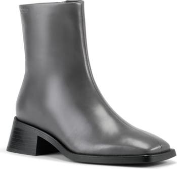 An inverted, stacked heel brings modern lift to this square-toe bootie lined with breathable leather and secured with a full-length side zipper.
