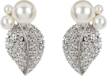 These handmade drop earrings evoke a vintage-inspired allure with glowing faux pearls resembling a bunch of grapes and pavé Austrian crystals crafted in leaf-like shapes.