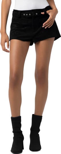 A matching grommet-trimmed belt highlights the low-rise waist of these edgy microshorts made from soft faux suede.