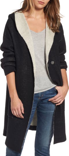 Contrasting lapels and a cozy hood top this soft and slouchy knit cardigan that perfectly marries comfort and laid-back cool.