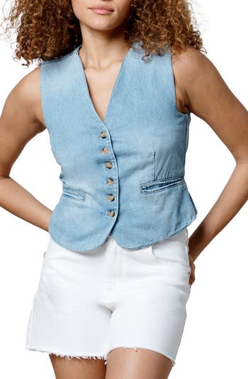 Bring a free-spirited '70s vibe to your warm-weather looks with this subtly cropped vest cut from nonstretch denim in a faded wash. Darts and a back belt deliver a curve-celebrating fit.
