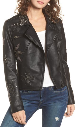 Studded with sparkling crystals and jet-black sequins, this faux leather jacket is part biker, part glam-rock and all cool.