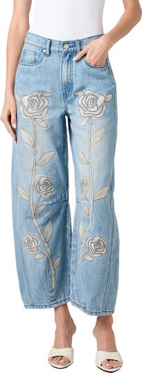 Rose embroidery adds a touch of elegance to these trend-savvy barrel-leg jeans fashioned from nonstretch denim.