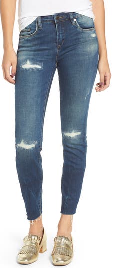 Raw hems and patched-up rips add lived-in vibes to these stretch-cotton skinny jeans in a classic blue wash.