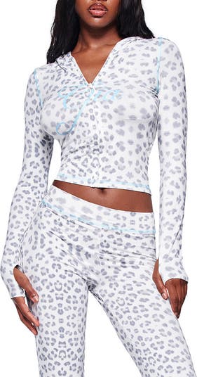 Take it easy in this soft stretch-knit hoodie cut in a cropped fit and stamped with a signature script.