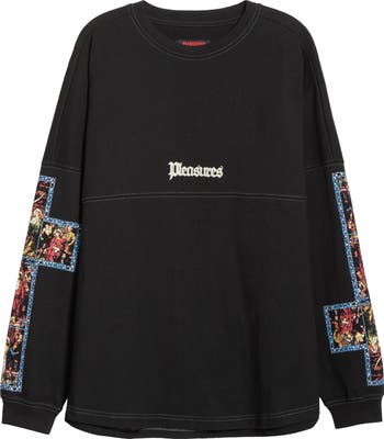 Boldly irreverent, this long-sleeve T-shirt is cut from premium cotton in a relaxed fit that feels substantial yet easy. Religious iconography runs down the sleeves, while rubber-printed branding at the chest and back, contrast stitching and ribbed trims sharpen the graphic impact.