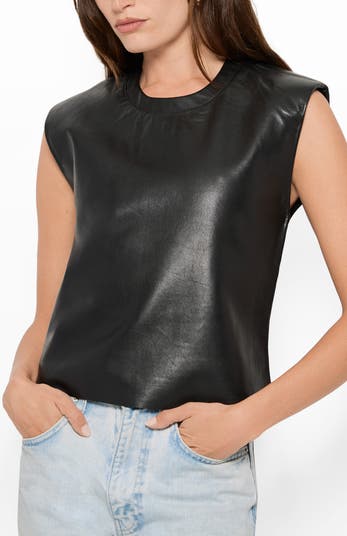 Sleek lines and padded shoulders bring edgy flair to our Blaze Recycled Leather Tee. Constructed from our signature recycled leather, Blaze features a boxy fit and drop armholes. Let yours add a touch of toughness to our Gigi Recycled Leather Leggings. - Our commitment to sustainability: We are plastic free. AS by DF packaging is made from 100% recycled materials and is 100% biodegradable.