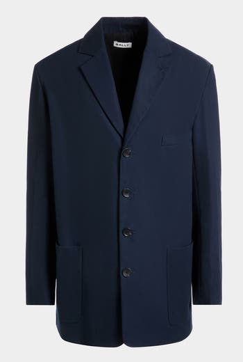Navy blue notch-lapel blazer in cotton blend fabric with four horn-effect buttons, a half-welt chest pocket, and two patch pockets at the front.