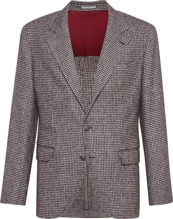 Long, airy alpaca fibers are blended together with wool to reinterpret the classic houndstooth pattern with a refined, retro-inspired nuanced effect. The small presence of synthetic fiber contributes to the fabric’s stability. The ultra-lightweight cupro lining perfects the garment’s comfort.