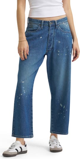 Bleach splatters bring a playful look to these lightweight, herringbone-striped jeans cut for a loose, cropped, drop-crotch fit inspired by '80s styles.