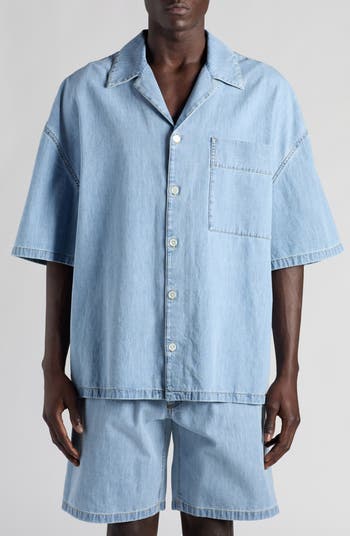 A topstitched 'V' centers the back yoke of this camp shirt cut in a roomy fit from denim in a bleached light wash.