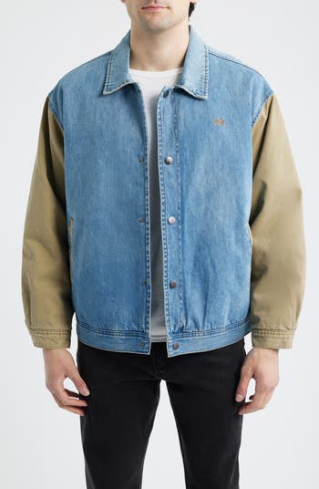 Khaki canvas and lightwash denim give a utilitarian look to a varsity jacket that earns its place in your closet forever.