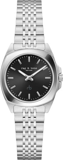 A beveled topring and minimalist dial underscore the timeless appeal of a quartz-powered watch set on a polished bracelet.
