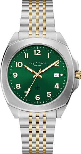 Arabic numeral markers and a functional date window emphasize the classic design of this quartz-powered timepiece fitted with a two-tone bracelet.